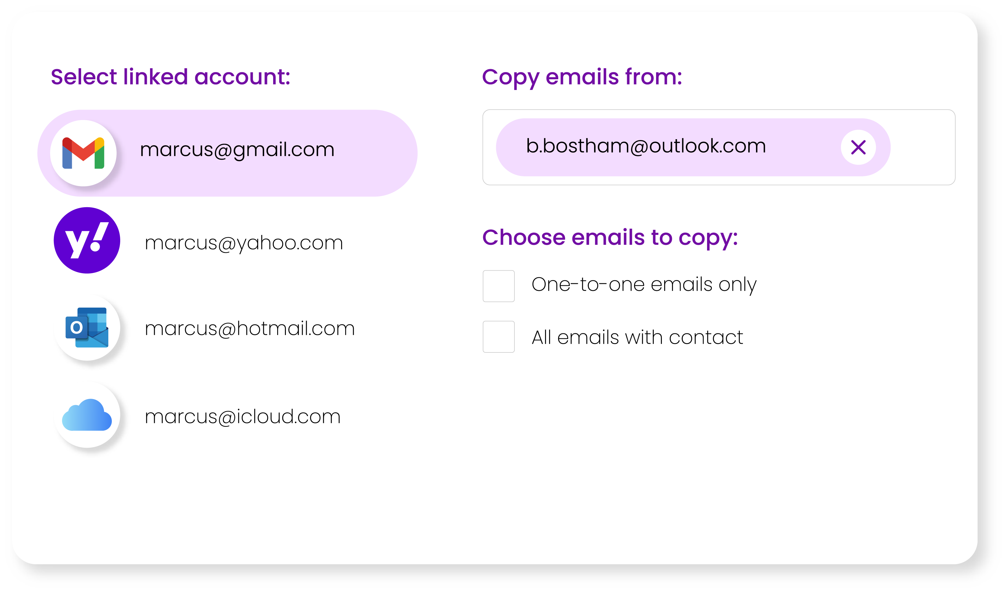 Link your account with Keepd and choose the contact you want the old emails from. Keepd will take care of the rest.